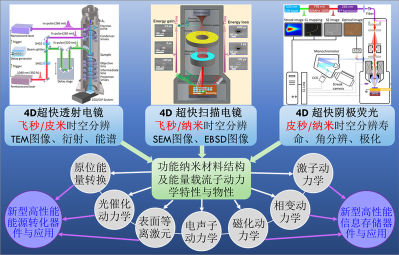 研究方向研究领域简介 物质的微观结构及其相关动力学行为从根本上决定了其物理与化学性质及潜在的功能和应用。例如功能纳米材料和人工纳米结构在能源转化、信息存储等应用中发挥作用时,其微观结构都发生着一系列复杂的物理和化学变化,涉及到形貌演化、结构相变、电荷转移、价态变化等动力学过程。这些动力学过程许多发生在飞秒(10-15 s)至纳秒(10-9 s)尺度。因此,在原子、分子尺度实时地观察物质微观结构的超快动力学过程一直是材料、物理、化学和生物等研究领域追逐的目标,也是深入理解其物性和开发新产品的关键。4D超快电子显微镜结合了电镜的超高空间分辨率和飞秒激光的超快时间分辨率,为研究物质的微观结构及其相关动力学行为提供了无限可能。其自2005年于加州理工成人直播(Caltech)诺奖得主Ahmed Zewail教授课题组诞生以来,已经在上述多个研究领域产生众多重要应用,成为电子显微学领域一个快速发展的新兴方向。 在成人直播 的大力支持下,我们建立了一个国际一流的综合性4D超快电子显微镜实验室,自主设计搭建了最新一代的4D超快透射电子显微镜(4D UTEM)、超快扫描电子显微镜(USEM)、超快阴极荧光(TRCL)、微区瞬态光谱及成像(TA/TRPL)、时间分辨的磁光探测(TR-MOKE,RMCD)等超高时空分辨电子、光子成像与探测系统,旨在探索最小和最快的未知微观世界。课题组长期从事4D超快电子显微镜技术和原子/纳米尺度的超快动力学及物理研究,重点关注和发展先进的新型原位4D UTEM、USEM、TRCL、TAM、TR-MOKE等超高时空分辨的电子、光子成像与探测技术,在空前的时空尺度下研究量子与纳米功能材料在能源转换、信息存储与传输等真实应用中的形貌及晶体结构演化、能量载流子传输与相互作用等超快动力学过程与物理机制,进而开发新器件和新应用。