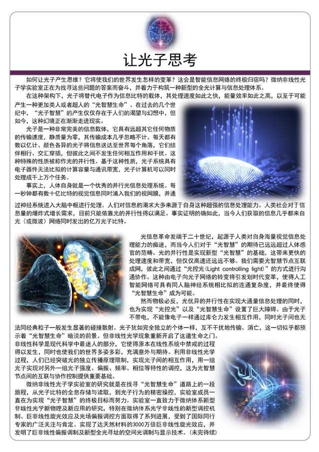 研究成果[76] Lu Bai, Lun Qu, Wei Wu, Zhidong Gu, Weiye Liu, Xueqian Zhao, Lishuan Wang, Wei Cai, Huasong Liu, Mengxin Ren*, Jingjun Xu*, Wavelength Tunable Second Harmonic Generation from Photonic Crystal Vertical Cavities. Adv. Optical Mater., 2402686 (2024). [75] Zhengqing He#, Lun Qu#, Wei Wu, Jikun Liu, Chunyan Jin, Chenxiong Wang, Jingfei You, Weiye Liu, Lu Bai, Zhidong Gu, Wei Cai, Mengxin Ren*, Jingjun Xu*, Electro-optically Modulated Nonlinear Metasurfaces, Nano Lett., 24, 14215-14221 (2024). [74] Jikun Liu, Lun Qu, Wei Wu, Chunyan Jin, Zhihao Chen, Zhidong Gu, Weiye Liu, Chenxiong Wang, Dahuai Zheng, Hongde Liu, Wei Cai, Mengxin Ren*, Jingjun Xu*, Lithium niobate thin film electro-optic modulator. Nanophotonics, 13, 1503-1508 (2024). [73] Jingfei You, Wei Wu*, Chunyan Jin; Lun Qu, Di Zhang, Jiwei Qi, Wei Cai, Mengxin Ren*, Jingjun Xu*, Raman characterization of focused ion beam fabricated lithium niobate film. J. Appl. Phys., 135, 033101 (2024). [72] Pengfei Zhu#, Di Zhang#, Xin Niu, Jinchao Liu*, Mengxin Ren*, Jingjun Xu*, A Lightweight Neural Network for Spectroscopic Ellipsometry Analysis. Adv. Optical Mater., 12, 2301381 (2023). [71] Jiang Fan, Zhiguo Sun, Yao Lu, Weiwei Luo*, Mengxin Ren, Wei Cai*, and Jingjun Xu, Topological super-modes engineering with acoustic graphene plasmons. Opt. Express, 31, 3698-3707 (2023). [70] Chunyan Jin#, Chenxiong Wang#, Lun Qu, Di Zhang, Qiang Liu, Jingfei You, Dahuai Zheng, Wei Wu, Wei Cai, Mengxin Ren*, Jingjun Xu*, Fast lithium niobate photodetector. Laser Photonics Rev., 17, 2300503 (2023). [69] Lun Qu, Zhidong Gu, Chenyang Li, Yuan Qin, Yiting Zhang, Di Zhang, Jiaxian Zhao, Qiang Liu, Chunyan Jin, Lishuan Wang, Wei Wu, Wei Cai, Huasong Liu, Mengxin Ren*, Jingjun Xu*, Bright second harmonic emission from photonic crystal vertical cavity. Adv. Funct., Mater., 33, 2308484 (2023). [68] 郑大怀,王烁琳,陈俊锟,张宇琦,刘宏德,任梦昕*,孔勇发*,许京军*。铌酸锂晶体:从全息存储到三维显示。中国激光,50, 1813001 (2023). [67] Mengxin Ren, Jingjun Xu*, et al, Roadmap on nonlinear optics – focus on chinese research. J. Phys. Photonics, 5, 032501 (2023). [66] Zhidong Gu, Haiyun Tan, Jiaxin Peng, Jiaxin Chen, Di Zhang, Fei Xie, Wei Wu, Wei Cai*, Mengxin Ren*, and Jingjun Xu*, Electro-optic modulation using lithium niobate metasurfaces with topological corner state. Appl. Phys. Lett., 122, 171706 (2023). [65] Qiang Liu*, Lun Qu, Zhidong Gu, Di Zhang, Wei Wu, Wei Cai, Mengxin Ren*, and Jingjun Xu*, Boosting second harmonic generation by merging bound states in the continuum. Phys. Rev. B, 107, 245408 (2023). [64] Fei Xie, Mengxin Ren*, Wei Wu, Wei Cai*, and Jingjun Xu*, Chiral metasurface refractive index sensor with a large figure of merit, Appl. Phys. Lett. 122, 071701 (2023) [63] Zhenxin Wang, Lufang Liu, Di Zhang, Alexey V. Krasavin, Junsheng Zheng, Chenxinyu Pan, Enxing He, Zifan Wang, Shengchengao Zhong, Zhiyong Li, Mengxin Ren, Xin Guo, Anatoly V. Zayats, Limin Tong, and Pan Wang*. Effect of Mirror Quality on Optical Response of Nanoparticle-on-Mirror Plasmonic Nanocavities. Adv. Optical Mater., 2201914 (2022). [62] Lun Qu, Lu Bai, Chunyan Jin, Qiang Liu, Wei Wu, Bofeng Gao, Juntao Li, Wei Cai, Mengxin Ren*, Jingjun Xu*. Giant Second Harmonic Generation from Membrane Metasurfaces. Nano Lett. 22, 9652 (2022). [61] Chenxiong Wang, Yiran Chen, Xiangqian Meng, Yilin Meng, Shengchao Gong, Mengxin Ren*, Jingjun Xu*. Error analysis of a rotating-metasurface polarimeter. Appl. Opt., 61, 9163 (2022). [60] Zhanghang Zhu#, Di Zhang#, Fei Xie, Junjun Ma, Jiaxin Chen, Shengchao Gong, Wei Wu, Wei Cai, Xinzheng Zhang, Mengxin Ren*, Jingjun Xu*. Nonlinear polarization imaging by parametric upconversion. Optica, 9, 1297 (2022). [59] Mengxin Ren, Jingjun Xu*. Quantum dot nanocomposites for flexible retina. Nat. Nanotech., 17, 819 (2022). [58] Mengxin Ren, Jingjun Xu*. Intelligent metasurfaces can recognize objects. Light: Sci. & Appl., 11, 211 (2022). [57] Chunyan Jin, Wei Wu*, Lei Cao, Bofeng Gao, Jiaxin Chen, Wei Cai*, Mengxin Ren*, Jingjun Xu*. Fabrication of lithium niobate metasurfaces via a combination of FIB and ICP-RIE. Chin. Opt. Lett., 20, 113602 (2022). [56] Zhidong Gu, Jiaxin Chen, Bofeng Gao, Wei Wu, Zhenyu Zhao, Wei Cai*, Xinzheng Zhang, Mengxin Ren*, Jingjun Xu*. Metasurfaces with high-Q resonances governed by topological edge state. Opt. Lett., 47, 1822-1825 (2022). [55] Di Zhang, Yang Chen, Shengchao Gong, Wei Wu, Wei Cai, Mengxin Ren*, Xifeng Ren*, Shuang Zhang, Guangcan Guo, Jingjun Xu*. All-optical modulation of quantum states by nonlinear metasurface. Light: Sci. & Appl., 11, 58 (2022). [54] Shengchao Gong, Yilin Meng, Chenxiong Wang, Yiran Chen, Xiangqian Meng, Wei Wu, Wei Cai, Mengxin Ren*, Jingjun Xu*. Full-Stokes polarimetry based on rotating metasurfaces. Appl. Phys. Lett., 120, 051110 (2022). [53] Ni Zhang#, Weiwei Luo#, Lei Wang#, Jiang Fan, Wei Wu, Mengxin Ren, Xinzheng Zhang, Wei Cai*, Jingjun Xu*.Strong in-plane scattering of acoustic graphene plasmons by surface atomic steps. Nat. Commun., 13, 983 (2022). [52] Xiaojie Jiang, Weiwei Luo*, Ni Zhang, Jiang Fan, Lei Wang, Yinxiao Xiang, Yao Lu, Zenghong Ma, Mengxin Ren, Xinzheng Zhang, Wei Cai*, Jingjun Xu*. In-plane reflection phase engineering of graphene plasmons realized by electronic boundary design at the nanoscale. AIP Adv., 12, 015108 (2022). [51] Zhaohang Xue, Wenzhuang Zheng, Yaolong Li, Mengfei Xue, Aiqin Hu, Junyan Chen, Shangtong Jia, Jinglin Tang, Jianing Chen, Jinlong Du, Peng Gao, Mengxin Ren, Shufeng Wang, Yunquan Liu, Hong Yang, Zhimin Liao, Guowei Lu*, Qihuang Gong. Ultraviolet/Visible Quasicylindrical Waves on Semimetal Cd3As2 Nanoplates. Adv. Photonics Res., 3, 2100354 (2022). [50] Jinchao Liu#, Di Zhang#, Dianqiang Yu, Mengxin Ren*, Jingjun Xu*. Machine learning powered ellipsometry. Light: Sci. & Appl., 10, 55 (2021). [49] Junjun Ma, Fei Xie, Weijin Chen, Jiaxin Chen, Wei Wu, Wei Liu, Yuntian Chen, Wei Cai, Mengxin Ren*, J